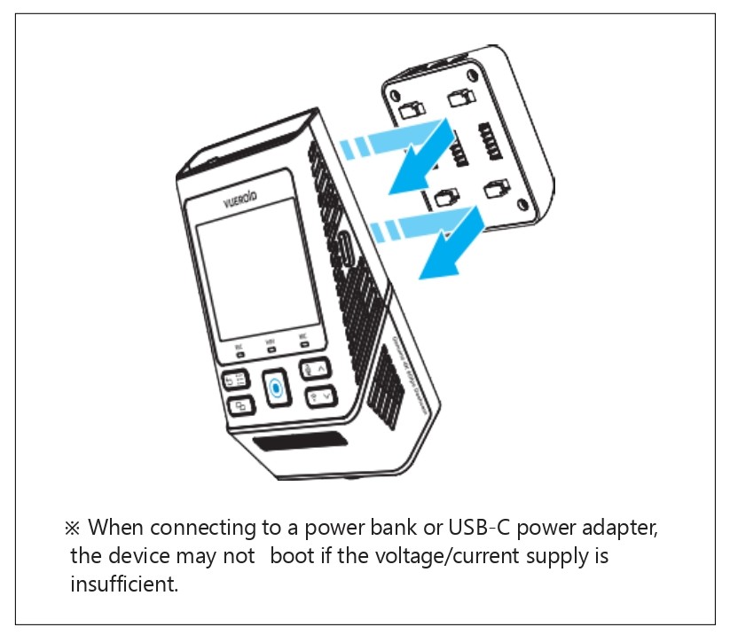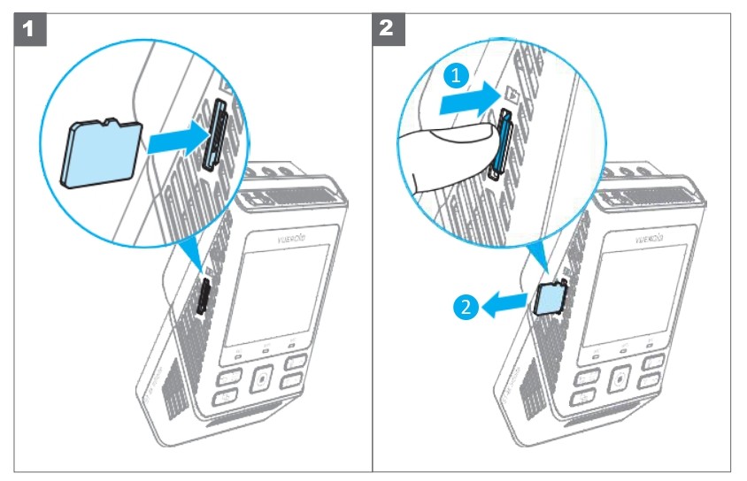 - Micro SD Card Replacement: Since the Micro SD Card is an expendable item, please replace it after extended use. Continuous use of the Micro SD Card may lead to recording issues. Regularly check the recording capacity of the Micro SD Card, and replace it when necessary. VUEROID is not responsible for any issues arising from the use of non-genuine Micro SD Cards.