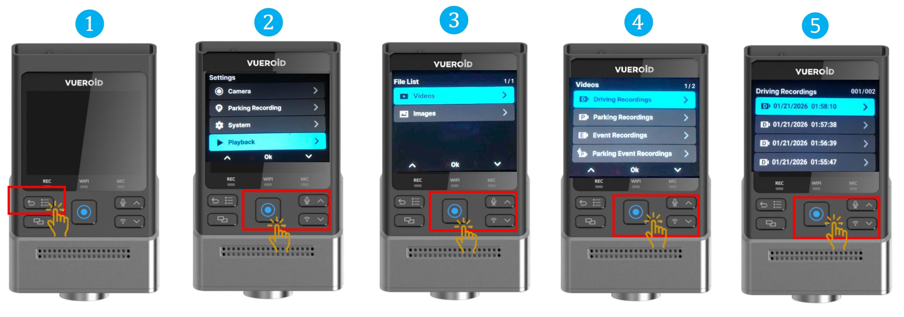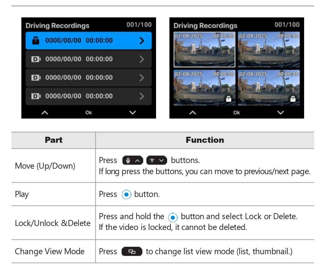 Settings > Playback > Videos > Driving Recording, Parking Recording, Event Recording, Parking Event Recording or Manual Recording.