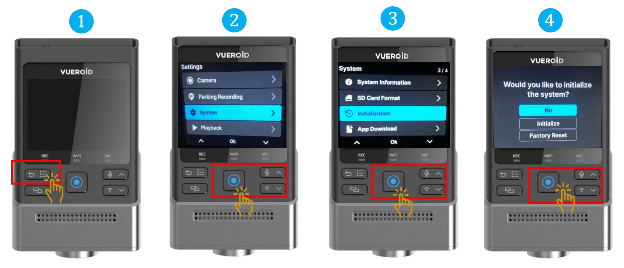 ※Initialize - Only the settings will be reset, and saved videos and other data will remain intact.