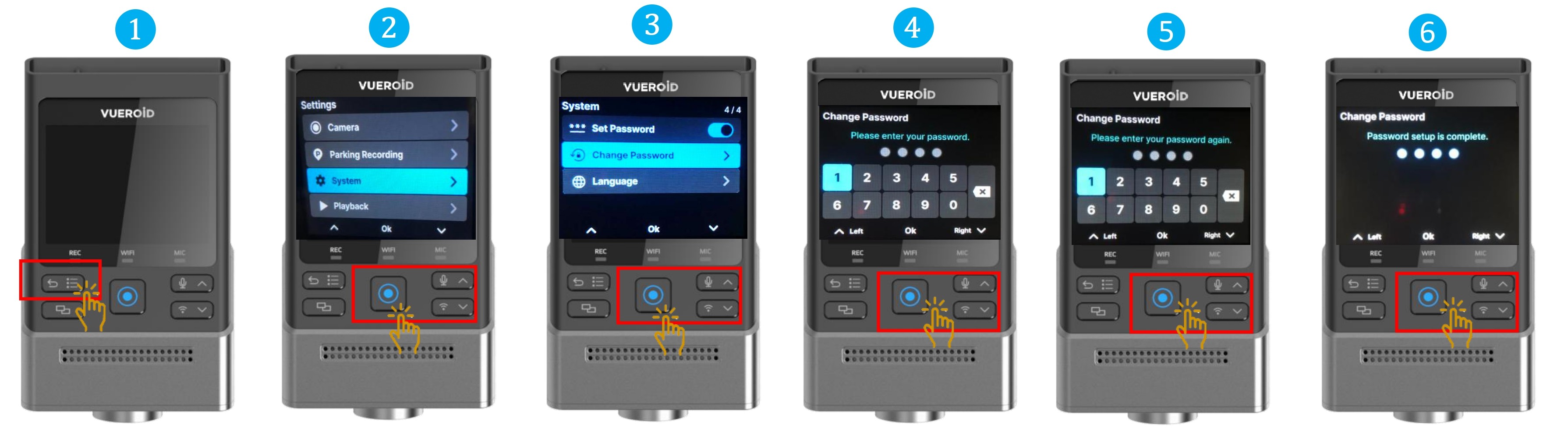 - Input NEW 4 numerical for the password setting then press Manual Record / Enter button.