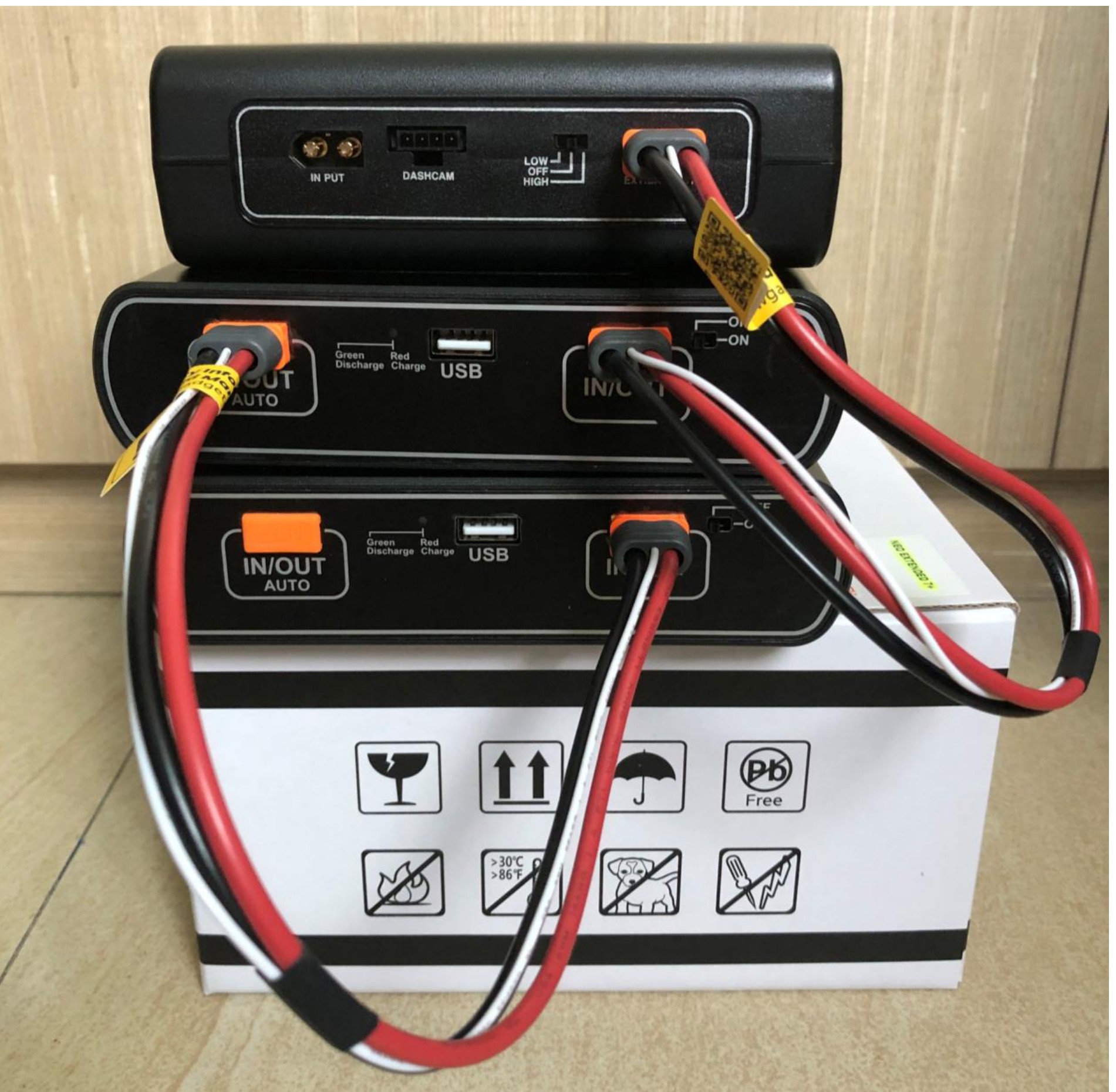 1) With the product’s power switch in the OFF position, connect the Input(charging) cable for the fuse box and output cable to the product’s cable connectors.
