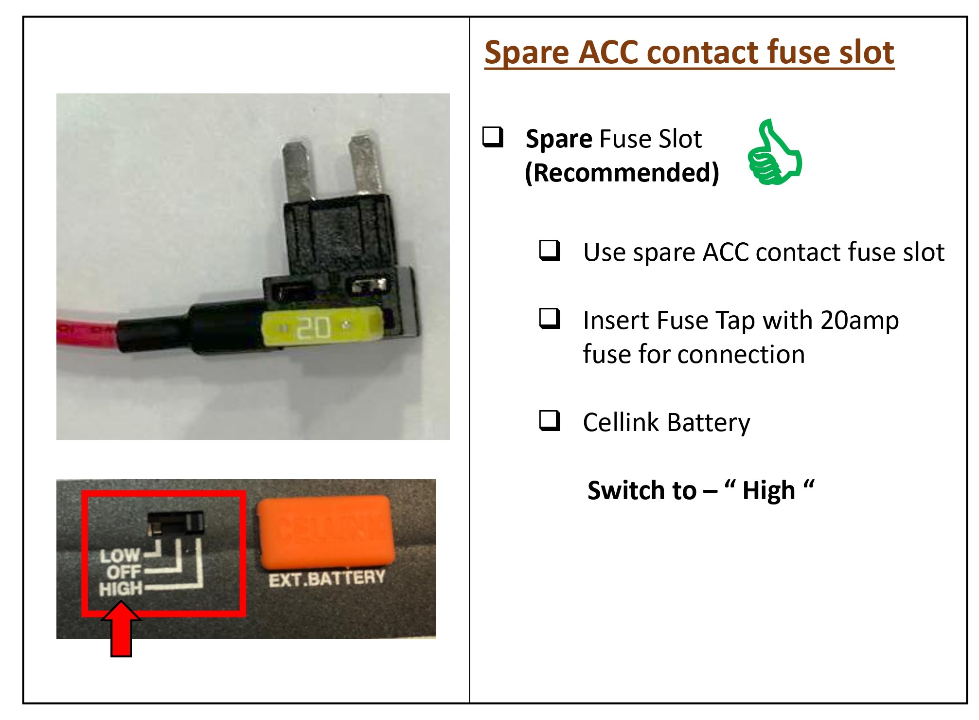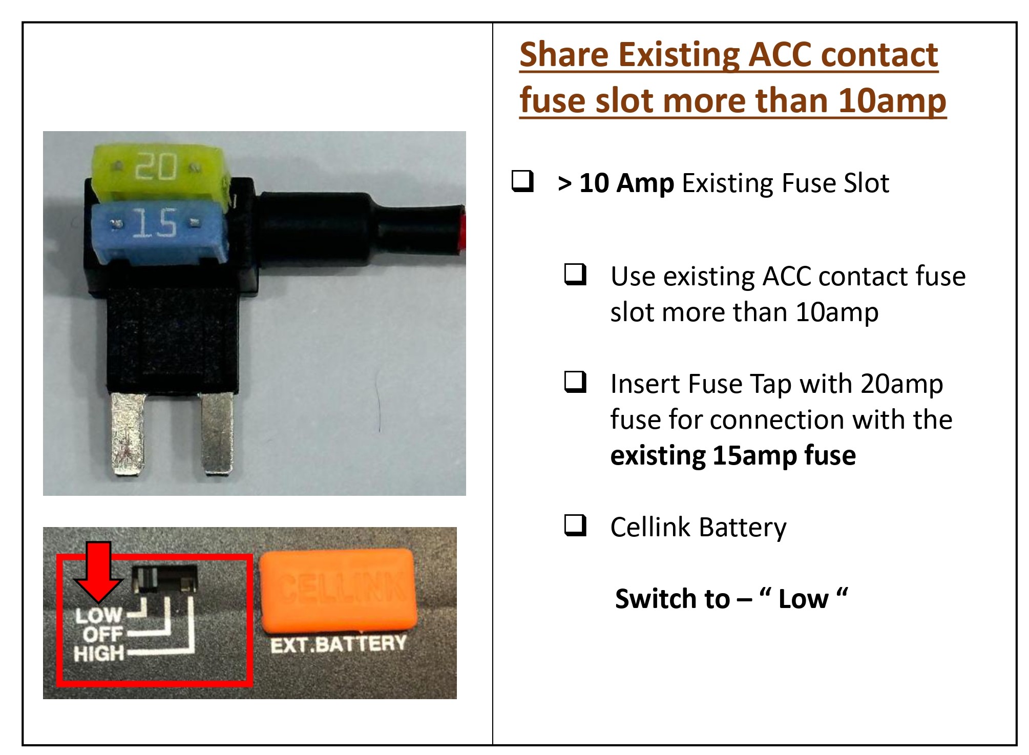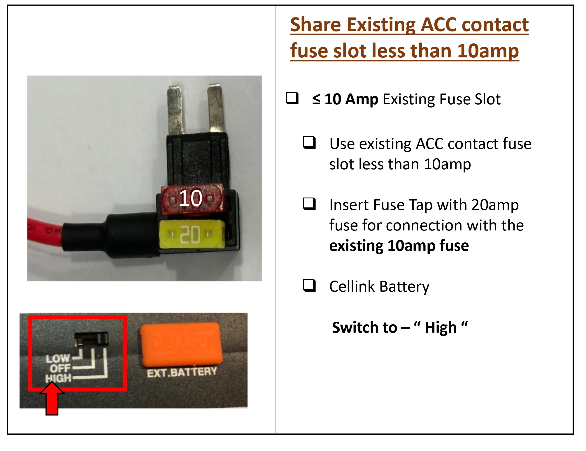 Inside the fuse box, there's two types of power available, permanent power (BATT) and ACC contact. Since our Cellink battery is charged only when the ACC is on, you must connect only to ACC contact. If you connect to BATT contact with permanent power, the car battery will be drained or cause some error on the dashboard.