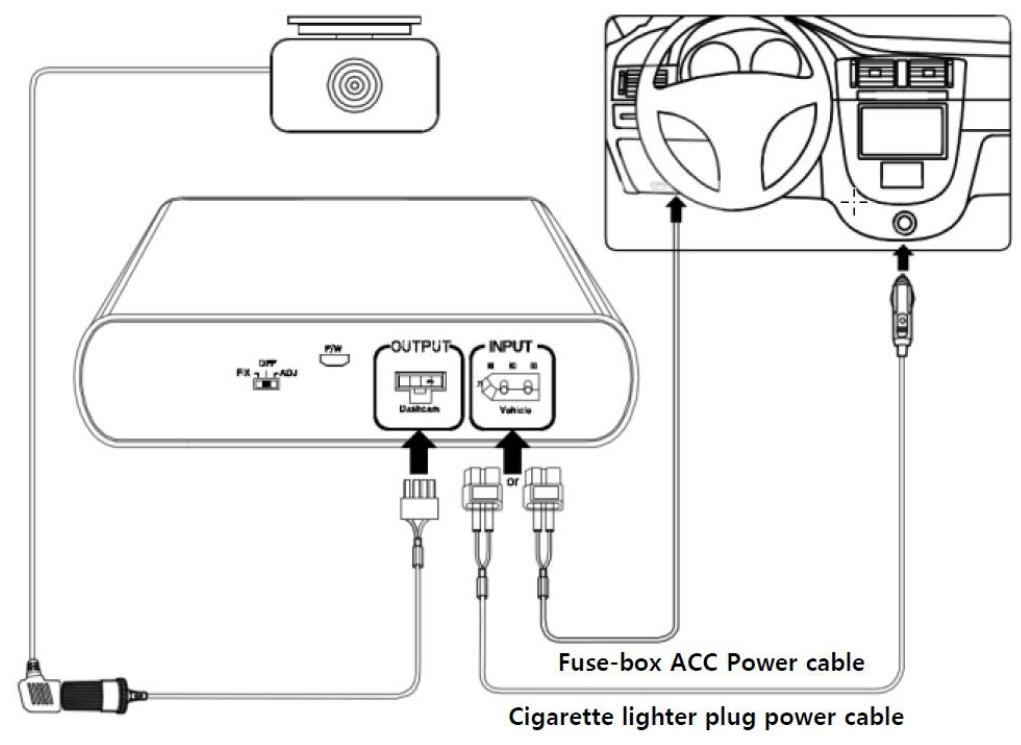 | Output Power | ▷ Dashcam connector | DC 11.0V ~ 14.2V | Max 2A | ||