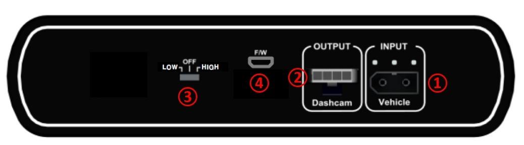 ● 2. OUTPUT : The discharging connector for connecting to the dashcam.