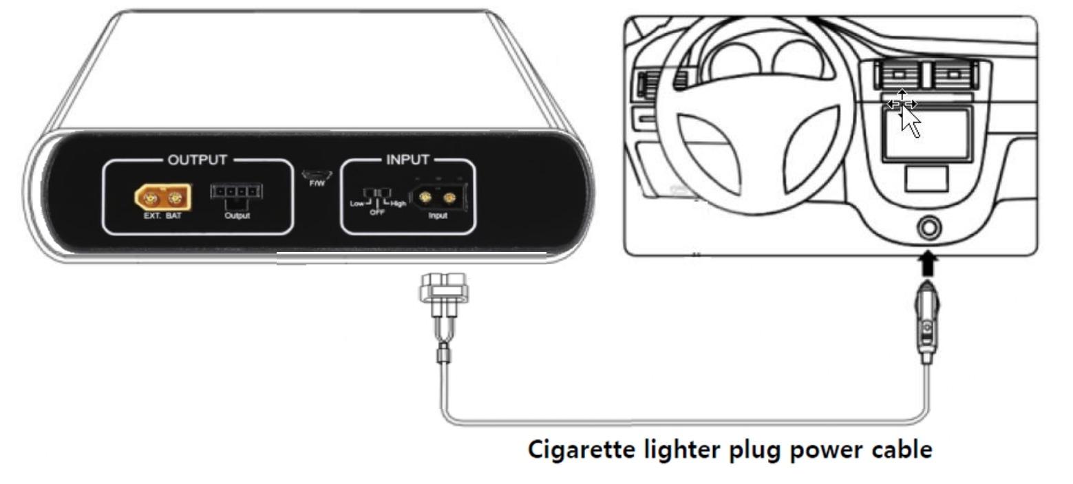 ● 1. INPUT : The charging connector for connecting to the Cigar lighter socket and ACC Power contact in Fuse box.