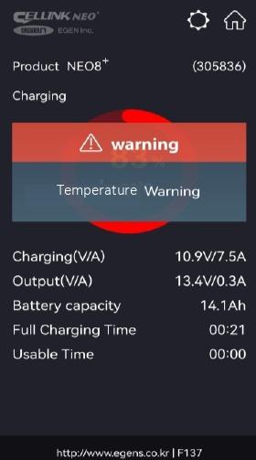 - The APP will put up a warning screen when the temperature inside the battery reaches the threshold of 80°C due to any abnormalities, the system will automatically stop to prevent overheating.