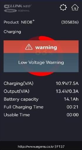 - The warning screen will be displayed and stop charging if the input voltage drops below 11V to prevent the vehicle's damage.