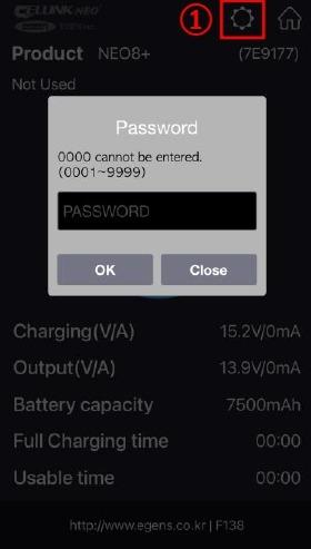 - You can enter the product setting screen by tapping the gear icon(①) on the main screen. The password is required to enter the product setting screen. The initial password is set to 1234.