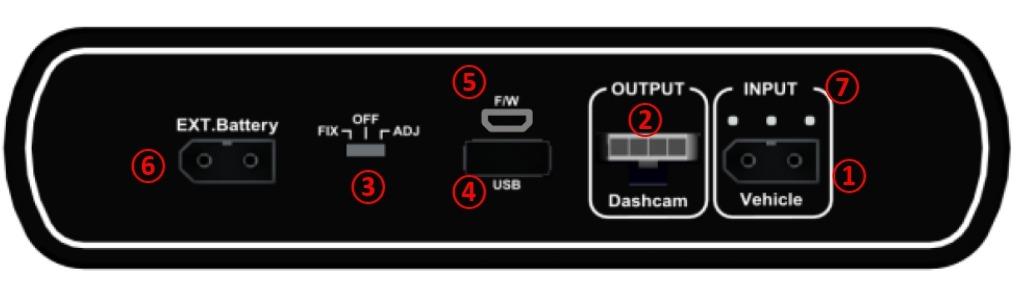 ● 2. OUTPUT : The discharging connector for connecting to the dashcam.