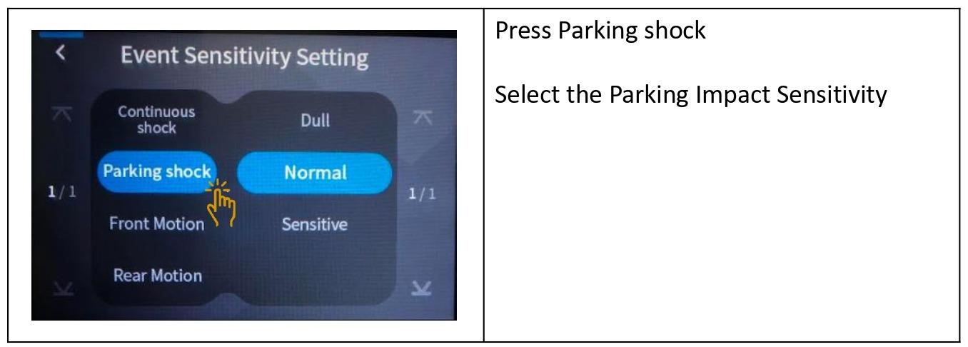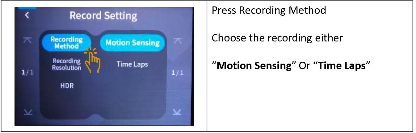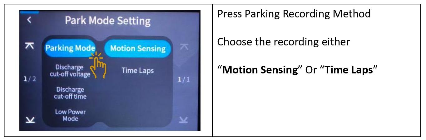 During the parking mode recording, user can choose either based on "Motion Sensing" or "Time Lapse" recording.