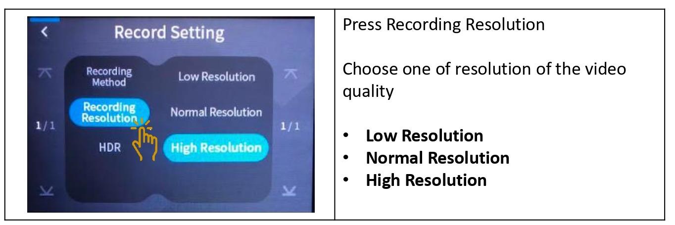 The image recording resolution can be select "LOW", "NORMAL" or "HIGH" quality.