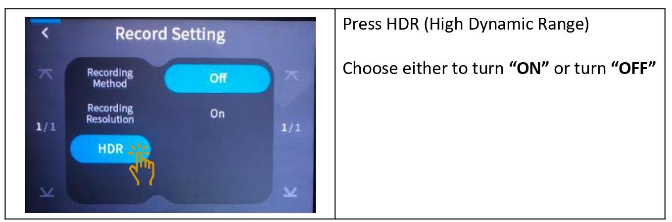 High Dynamic Range (HDR) improves the contrast in a video while maintaining clarity in high contrast or low-light conditions. This means the whole scene looks more like how your eyes see it.Click on "HDR" to be set .Select "ON" or "OFF"