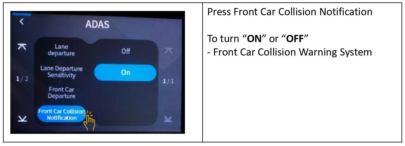 Click on Front Car Collision Notification (Forward Collision Warning System) to turn "ON" or "OFF" the warning alarm.