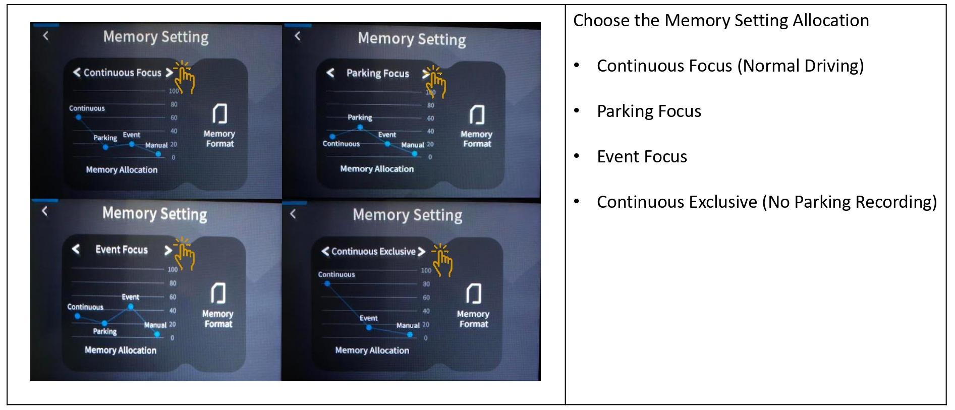 Memory Assign - This function allows user to choose to prioritize the recorded videos in the memory card allocation.