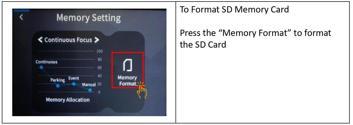 Once the Driving Record setting is switch to either one setting Normal Recording or Time Lapse Recording, the dashcam itself will auto format the SD card.