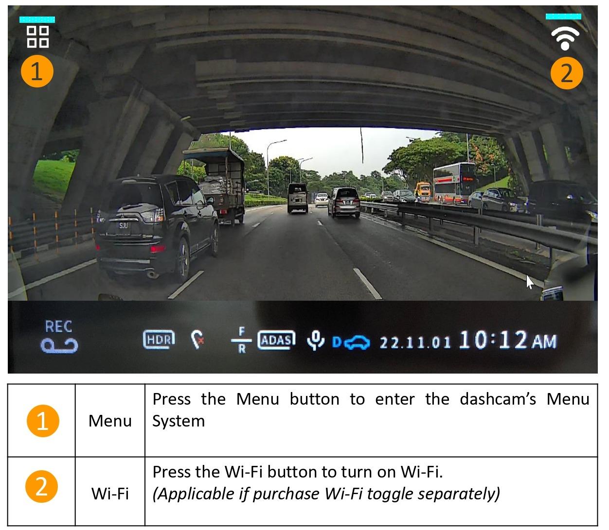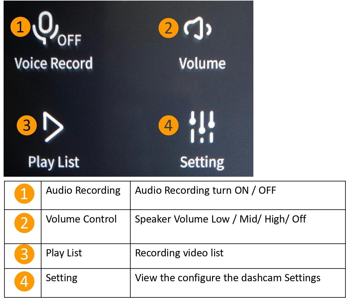 - To turn "ON" or "OFF" for audio recording by pressing the Voice Record icon on the dashcam screen.