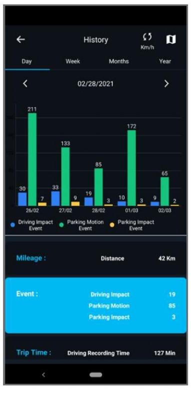 It logs every trip you take and reports like mileage and trip time, as well as any impact events that might have occurred on the road.