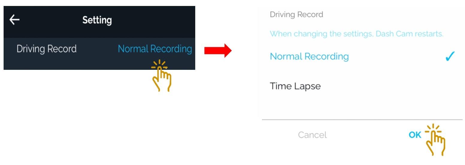 During the driving mode recording, user can choose either based on time lapse recording or normal recording.