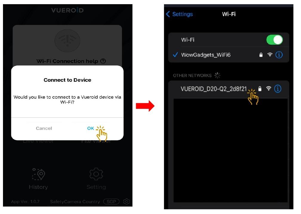 In the Wi-Fi network listing, click on the VUEROID dashcam SSID in the form of "VUEROID_D20_Q2_XXXXXX"
