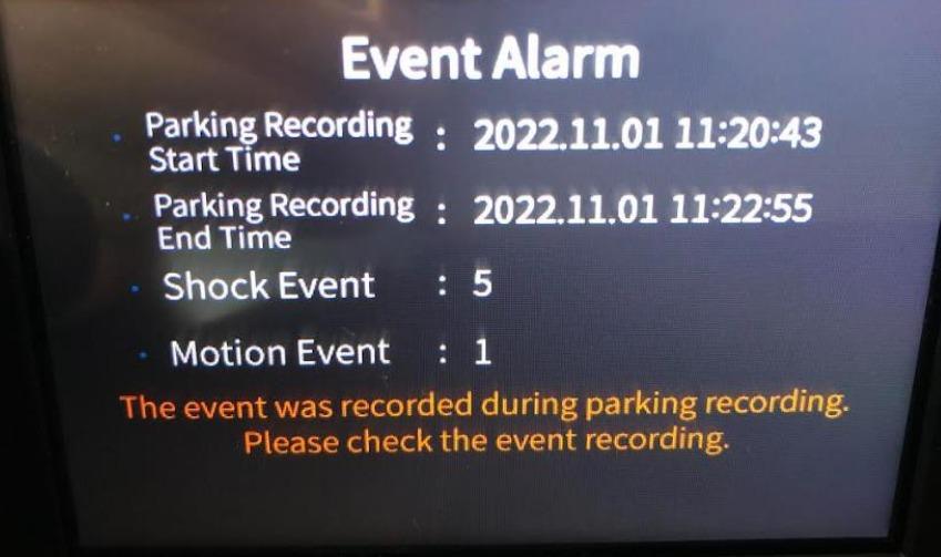 Event Alarm will prompt is there any event files (Shock/Motion) has been recorded during the parking mode recording.