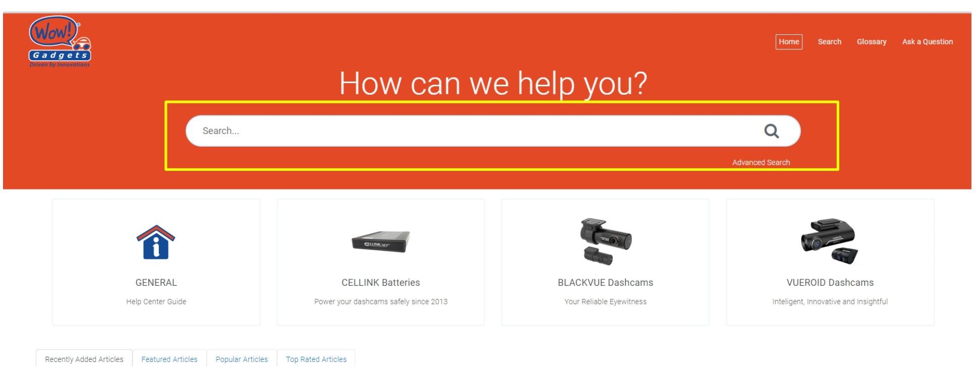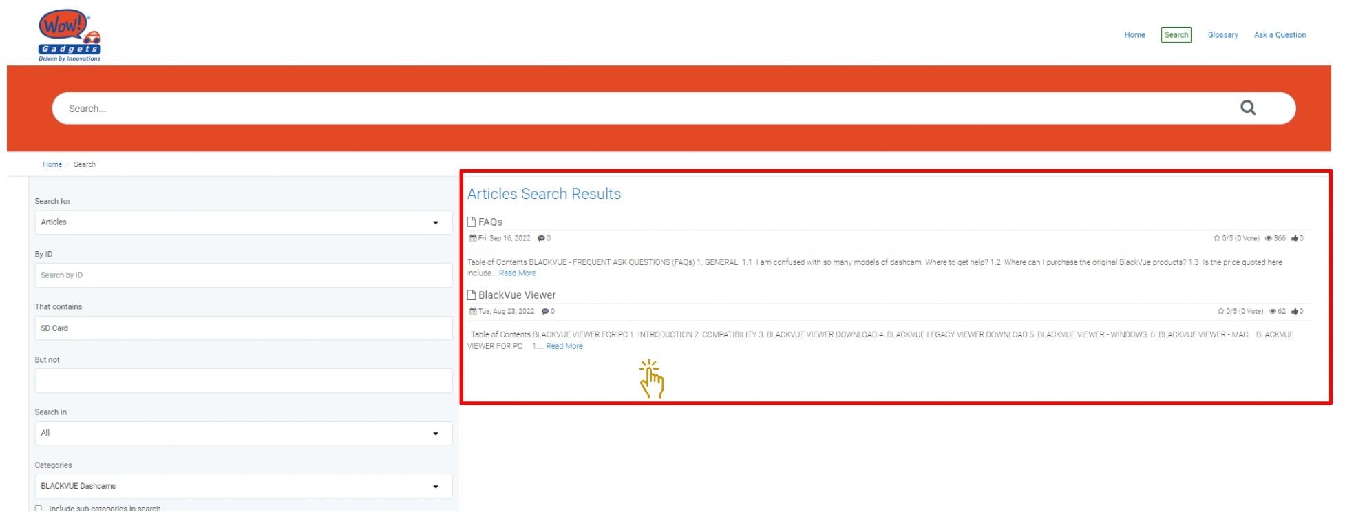 - You can search the help center articles/FAQs by typing the keywords in the search bar. For example, if you type "SD card", you will get all SD card-related articles uploaded by our support team.