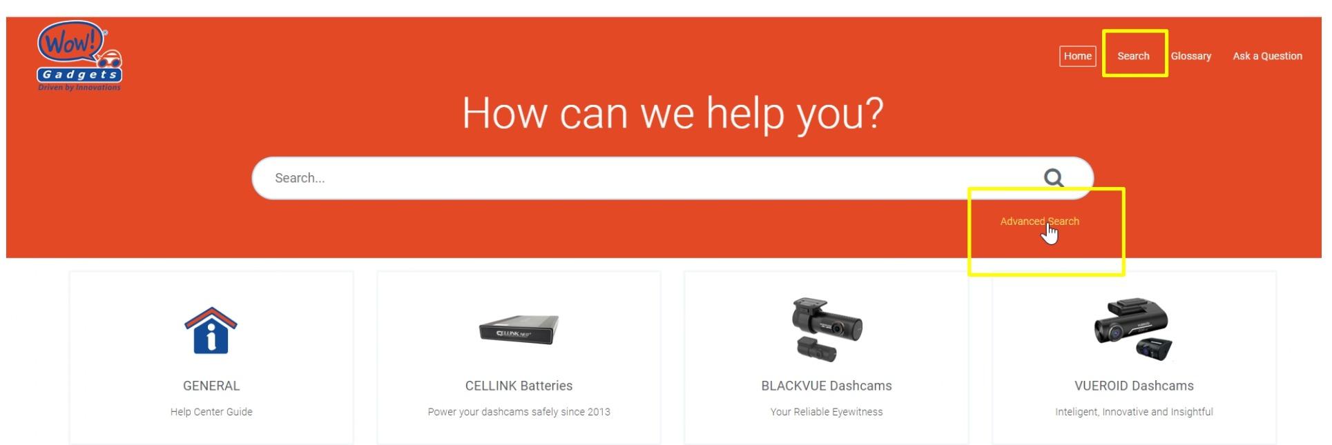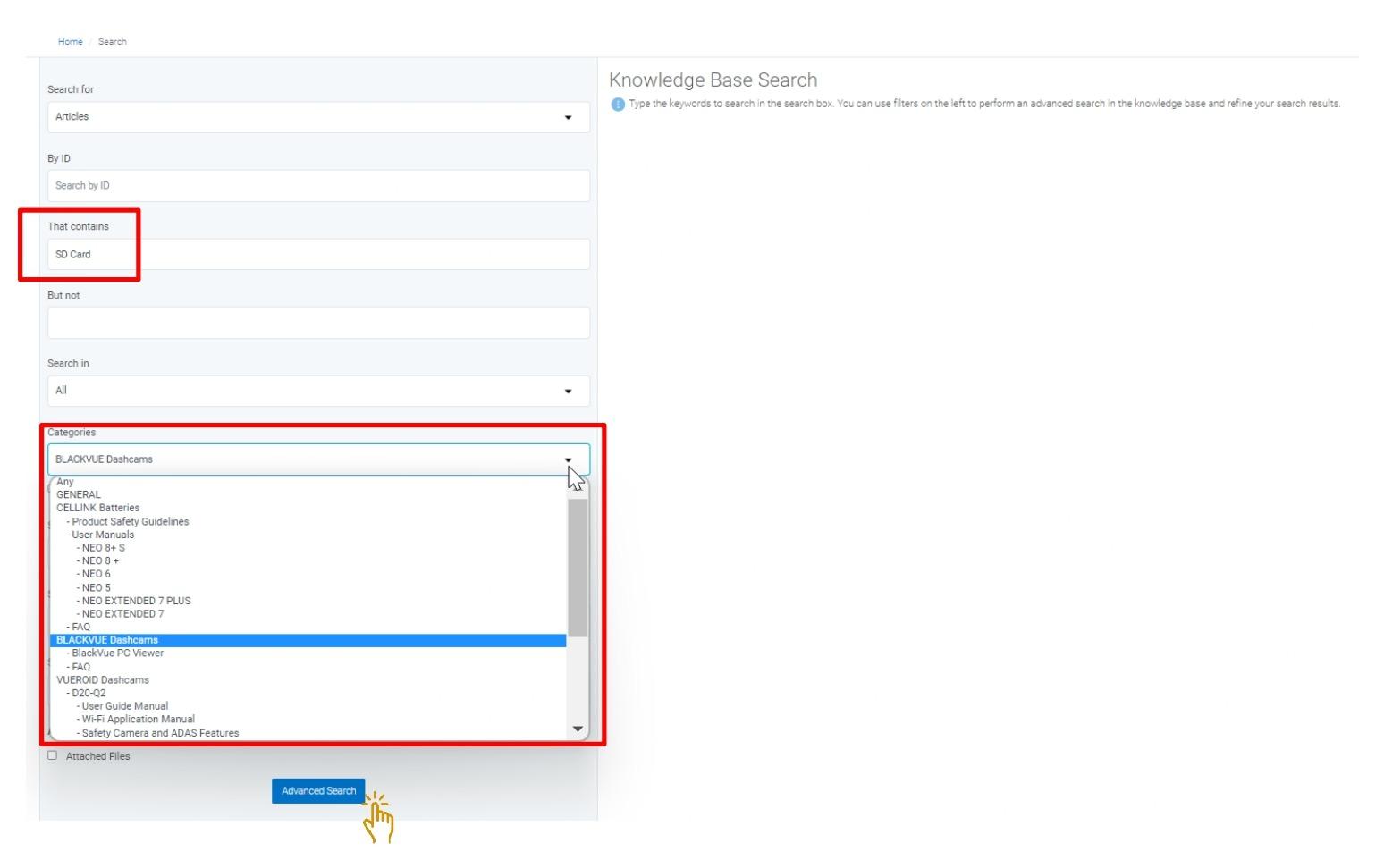 - Alternatively, by clicking on the "Advanced Search" you can narrow down your search by selecting "Categories" (Brand: BlackVue, Vueroid, Cellink) and "Keywords".